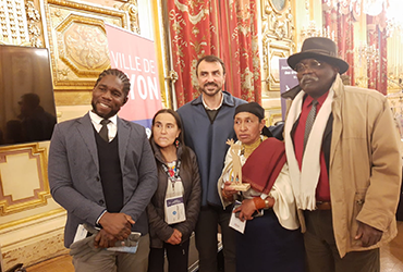 Le président d'AENSAH était invité par le Maire de Lyon pour la journée internationale des droits humains. À gauche un Haïtien et la Guatémaltèque la femme d'un activiste des droits humains tué à cause de défense des terres dans le cadre des droits humains Guatémaltèques, au milieu, le Maire de Lyon écologique et à droite la responsable du projet de femmes paysannes Guatémaltèques fondé par l'activiste qui été tué, puis le président d'AENSAH association.