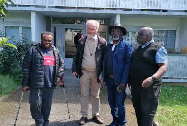 Photo prise le jour de la présence de Monsieur Jean-Pierre GODDING responsable de la communauté du chemin Neuf Kinshasa ici en France au siège à 12 rue neuve des Essarts Bron, lors de la réunion de travail du 8 mai 2024. A gauche c'est la secrétaire comptable avec des béquilles directement suivi de frère Jean-Pierre GODDING, puis avec un chapeau le président d'AENSAH association et à droite le coordonnateur des activités de l'association AENSAH.