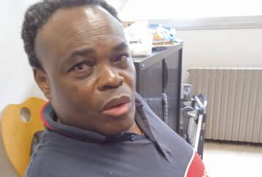 Voici le premier handicapé de Kinshasa que AENSAH association a commencé à aider lorsque que le président d'AENSAH l'avait repéré dans une émission de la RTNC Radio Télévision Nationale Congolaise. Il marchait sans fauteuil roulant et avec ses mains. Cela avait touché le coeur du Président de l'association qui avait immédiatement entré en contact avec la journaliste qui donnait l'émission sur l'handicap et le dévellopement. Puis le président AENSAH lui a envoyé un fauteuil roulant pour que sa femme s'occupe de lui. Ils ont eu un bébé comme vous le voyez sur la photo au côté du président de l'association.