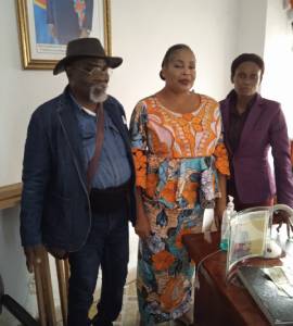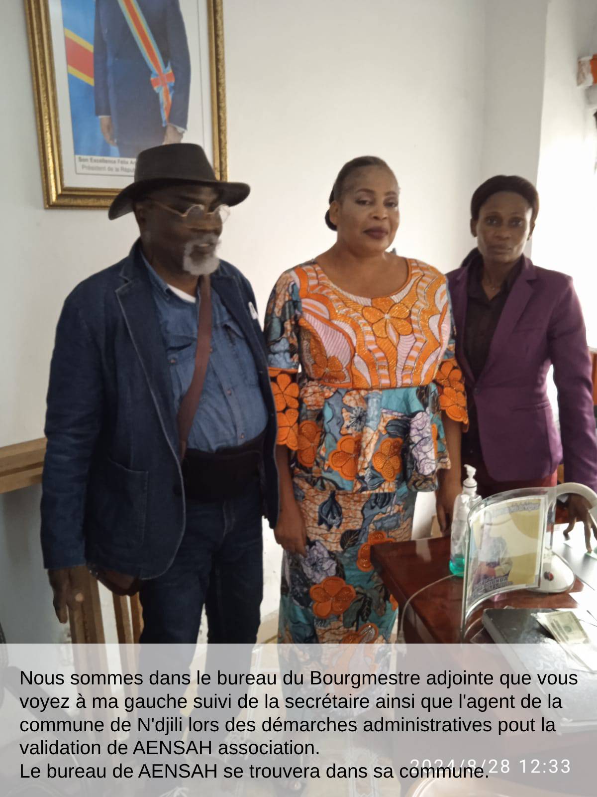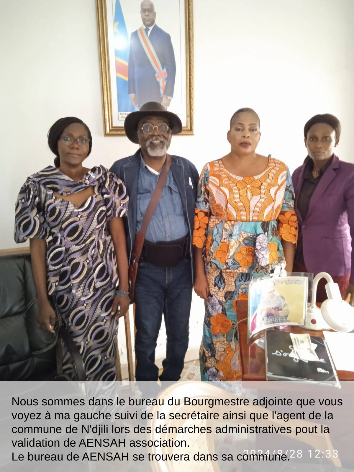 Nous sommes dans le bureau du Bourgmestre adjointe que vous voyez à ma gauche suivi de la secrétaire ainsi que l'agent de la commune de N'djili lors des démarches administratives pout la validation de AENSAH association. Le bureau de AENSAH se trouvera dans sa commune.