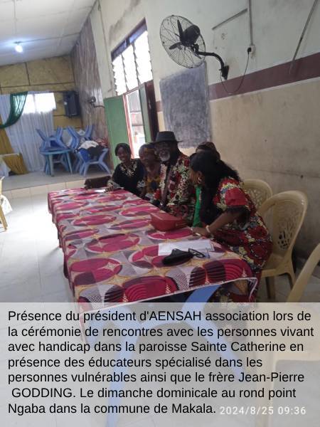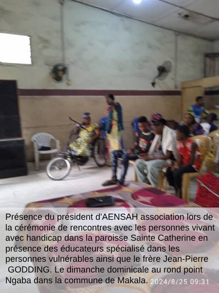Présence du président d'AENSAH association lors de la cérémonie de rencontres avec les personnes vivant avec handicap dans la paroisse Sainte Catherine en présence des éducateurs spécialisé dans les personnes vulnérables ainsi que le frère Jean-Pierre GODDING. Le dimanche dominicale au rond point Ngaba dans la commune de Makala.