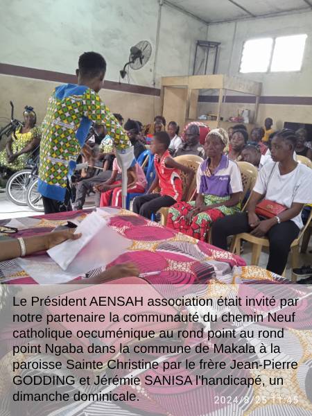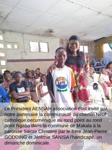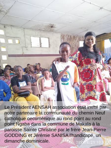 Le Président AENSAH association était invité par notre partenaire la communauté du chemin Neuf catholique oecuménique au rond point au rond point Ngaba dans la commune de Makala à la paroisse Sainte Christine par le frère Jean-Pierre GODDING et Jérémie SANISA l'handicapé, un dimanche dominicale.