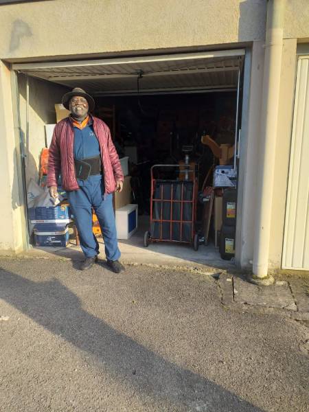 Président AENSAH devant son garage où il garde les objets de l'association